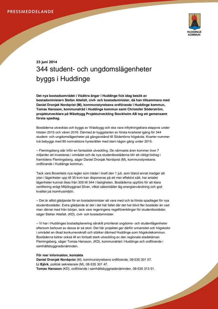Det nya bostadsområdet i Visättra ängar i Huddinge fick idag besök av bostadsministern Stefan Attefall, civil- och bostadsminister, då han tillsammans med Daniel Dronjak Nordqvist (M), kommunstyrelsens ordförande i Huddinge kommun, Tomas Hansson, kommunalråd i Huddinge kommun samt Christofer Söderström, projektutvecklare på Wästbygg Projektutveckling Stockholm AB tog ett gemensamt första spadtag.
