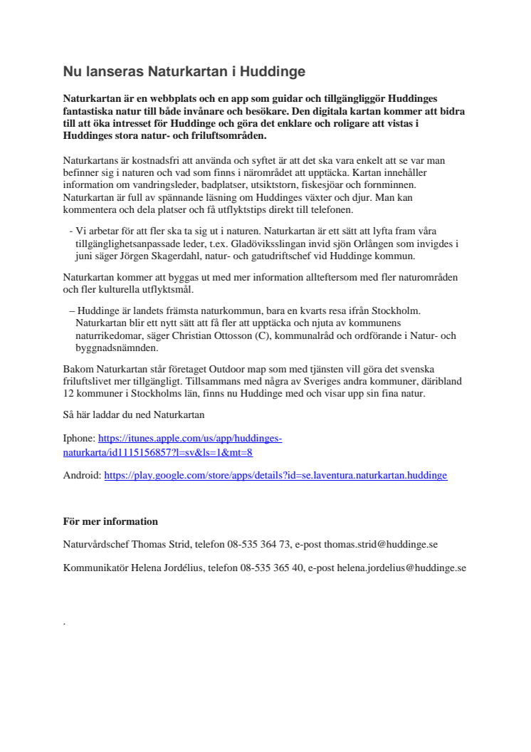 Naturkartan är en webbplats och en app som guidar och tillgängliggör Huddinges fantastiska natur till både invånare och besökare. Den digitala kartan kommer att bidra till att öka intresset för Huddinge och göra det enklare och roligare att vistas i Huddinges stora natur- och friluftsområden.