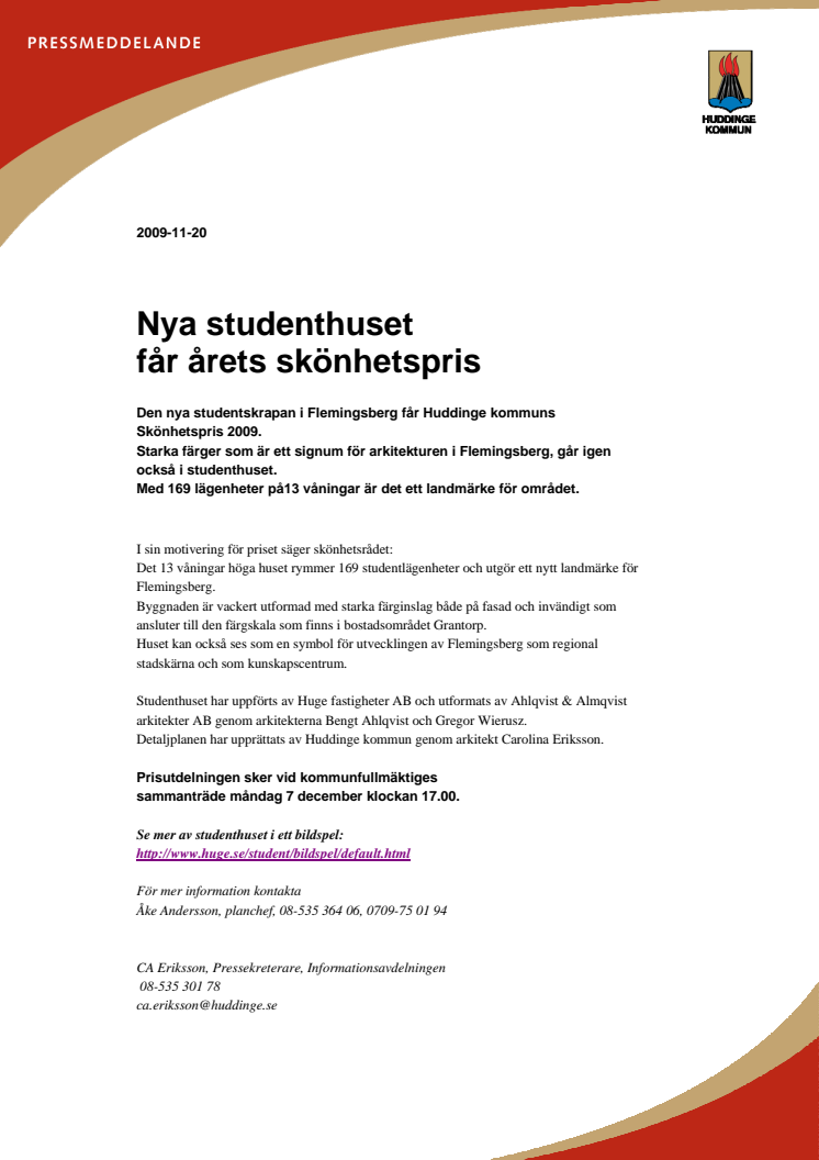 Den nya studentskrapan i Flemingsberg får Huddinge kommuns Skönhetspris 2009. Starka färger som är ett signum för arkitekturen i Flemingsberg, går igen också i studenthuset. Med 169 lägenheter på13 våningar är det ett landmärke för området.