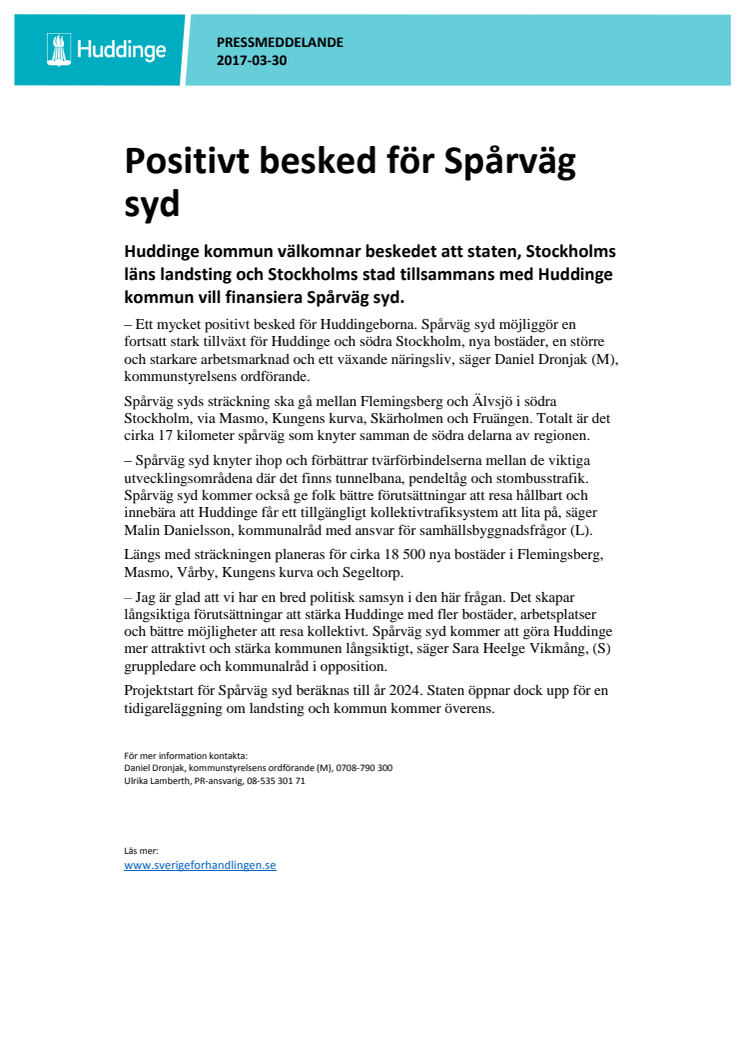 Huddinge kommun välkomnar beskedet att staten, Stockholms läns landsting och Stockholms stad tillsammans med Huddinge kommun vill finansiera Spårväg syd.