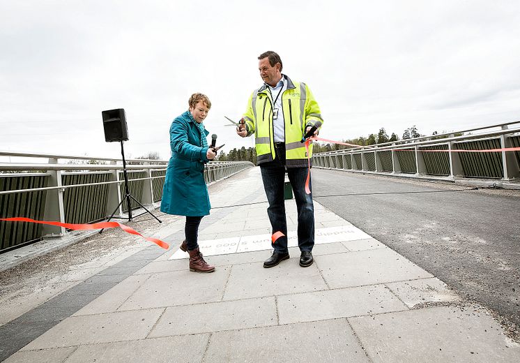 Invigning av Sadelmakarbron i Kungens kurva, Huddinge kommun. Malin Danielsson (L), ordförande i kommunstyrelsens samhällsbyggnadsutskott Huddinge kommun och Per Lunde, biträdande projektledare vid Trafikverket klipper bandet. Bilden får användas i nyhetssammanhang.