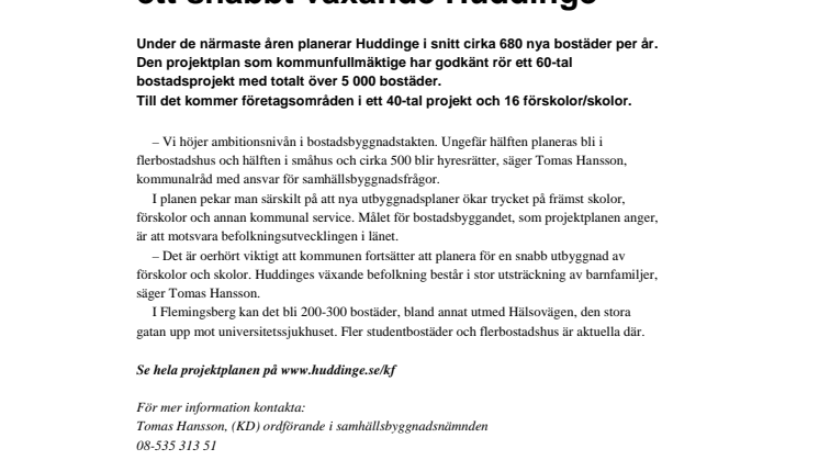 – Det är oerhört viktigt att kommunen fortsätter att planera för en snabb utbyggnad av förskolor och skolor. Huddinges växande befolkning består i stor utsträckning av barnfamiljer, säger Tomas Hansson.