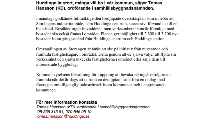 I måndags godkände fullmäktige den fördjupade översiktsplan som innebär att Storängens industriområde, nära Huddinge centrum, successivt förvandlas till en blandstad. Bostäder utgör huvuddelen men verksamheter som är förenliga med bostäder ska också finnas i området. Planen ger möjlighet till 2 300 till 3 200 nya bostäder inom gångavstånd från