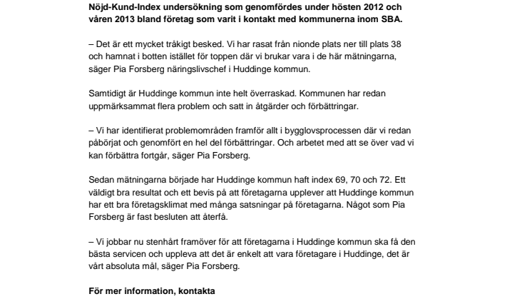 – Det är ett mycket tråkigt besked. Vi har rasat från nionde plats ner till plats 38 och hamnat i botten istället för toppen där vi brukar vara i de här mätningarna, säger Pia Forsberg näringslivschef i Huddinge kommun.