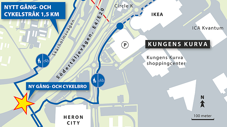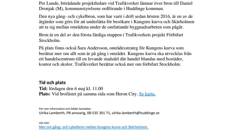 Lördagen den 6 maj inviger Trafikverket och Huddinge kommun den nya gång- och cykelbron vid Heron city i Kungens kurva.