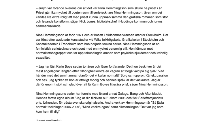 – Juryn var rörande överens om att det var Nina Hemmingsson som skulle ha priset i år. Priset går lika mycket till poeten som till serietecknare Nina Hemmingsson, även om det kändes lite extra roligt att med priset kunna uppmärksamma den grafiska romanen som stor och levande konstform, säger Nick Jones, bibliotekschef i Huddinge kommun och juryns sammankallande.