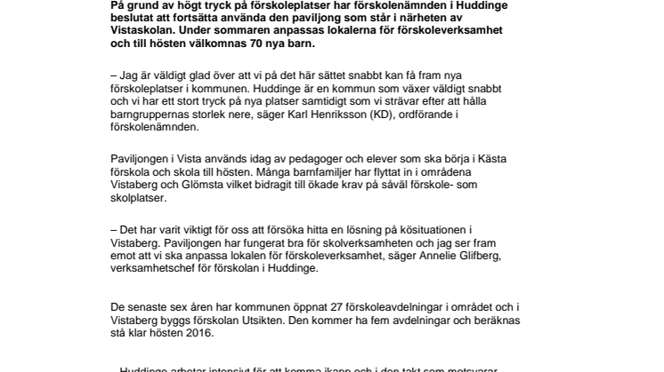 På grund av högt tryck på förskoleplatser har förskolenämnden i Huddinge beslutat att fortsätta använda den paviljong som står i närheten av Vistaskolan. Under sommaren anpassas lokalerna för förskoleverksamhet och till hösten välkomnas 70 nya barn.