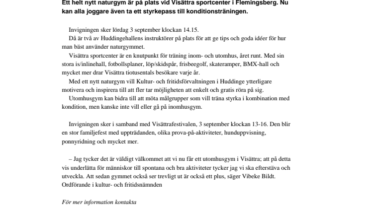 – Jag tycker det är väldigt välkommet att vi nu får ett utomhusgym i Visättra; att på detta vis underlätta för människor till spontana och bra aktiviteter tycker jag vi ska efterstäva och utveckla. Att sedan gymmet också ser trevligt ut är också ett plus, säger Vibeke Bildt. Ordförande i kultur- och fritidsnämnden
